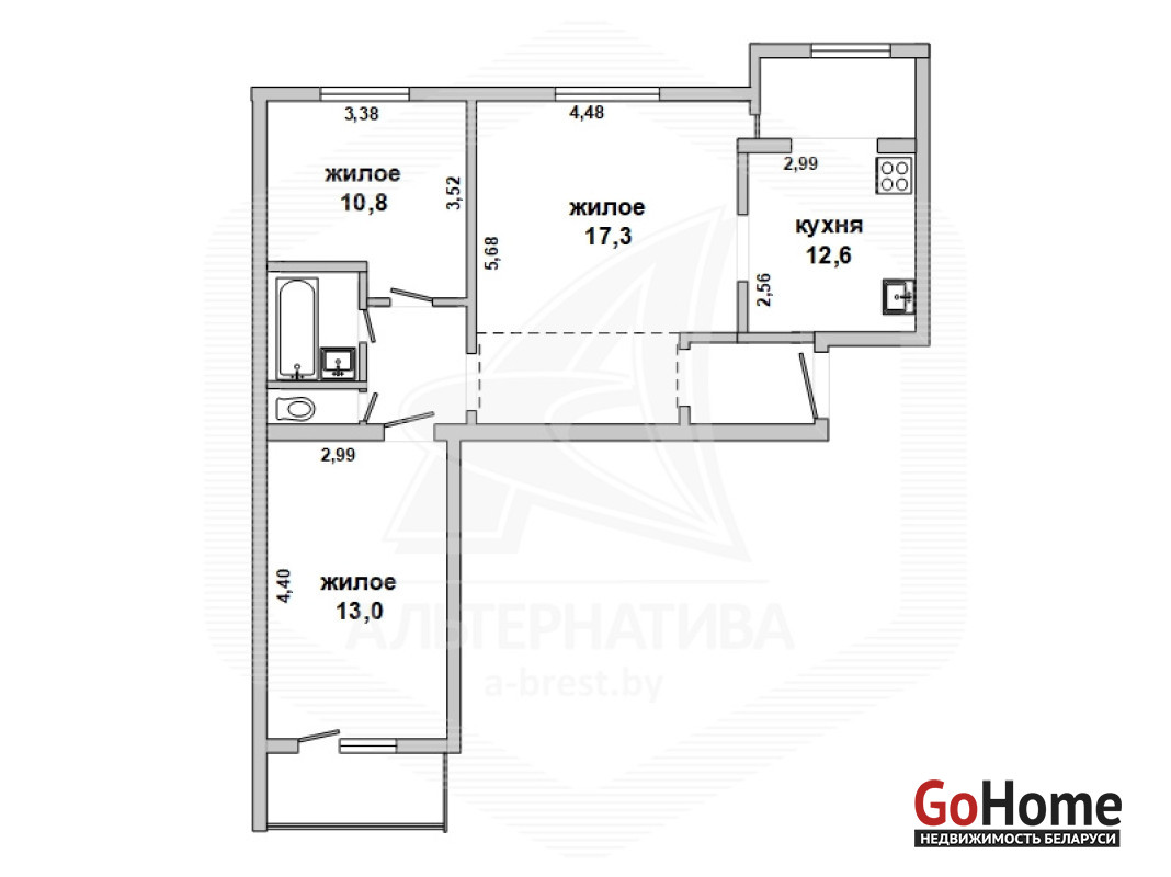 3-комнатная квартира, г. Брест, ул. Московская, 1975 г.п., 1 / 9 кирпич, 71,3 / 69,9 / 41,1 / 12,6, санузел раздельный, лоджия застеклена, подвал, деревянные стеклопакеты, межкомнатные двери деревянные, потолки - снежка, полы - ламинат, в санузле новая плитка и сантехника, бойлер, кондиционер, сигнализация. Встроенный кухонный гарнитур, два шкафа купе. Квартира с хорошим ремонтом. Возможен вывод в нежилой фонд. Лот - 161136