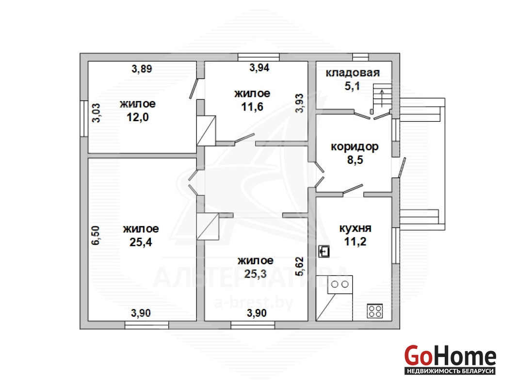 Жилой дом в Кобринском р-не. 1995 г.п. 1 этаж, мансарда, подвальный этаж. Общ.СНБ - 99,0 кв.м, общ.- 99,0 кв.м, жил.- 74,2 кв.м, кух.- 11,2 кв.м. 4 комнаты, высота потолка - 2,50 м.