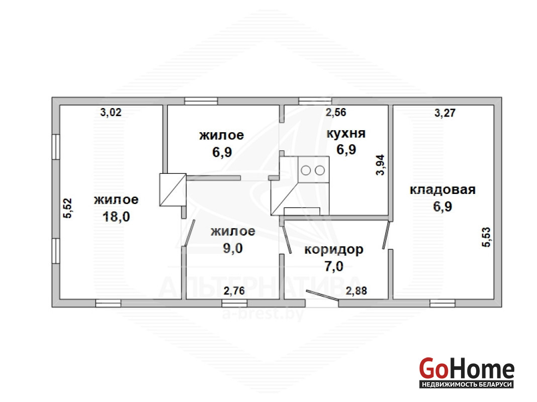 Агроусадьба в Кобринском р-не. 1927 г.п. 1 этаж. Общ.СНБ - 66,0 кв.м, общ.- 66,0 кв.м, жил.- 34,0 кв.м, кух.- 6,9 кв.м. 3 комнаты, высота потолка - 2,50 м.