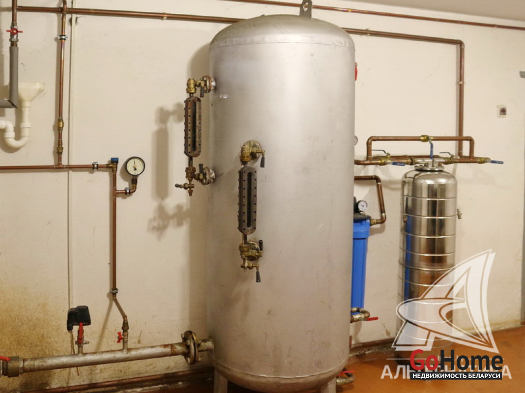 Коммуникации: отопление - газовый котел, твердотопливный и газогенератор, газ - централизованный, водоснабжение - скважина (76 м), гидрофор и колодец, электричество - централизованное, канализация - автономная.