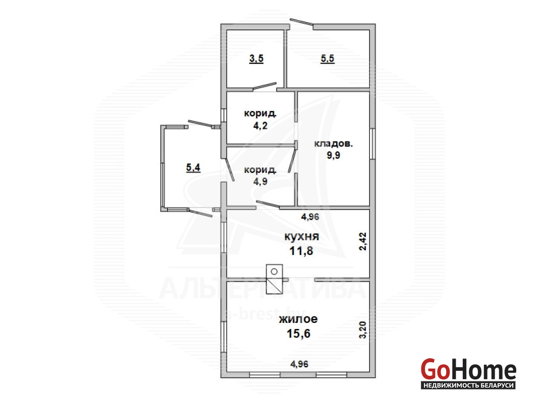 Жилой дом в Жабинковском р-не. 1938 г.п. 1 этаж. Общ.СНБ - 60,8 кв.м, общ.- 46,4 кв.м, жил.- 15,6 кв.м, кух.- 11,8 кв.м. 1 комната, высота потолка - 2,5 м.