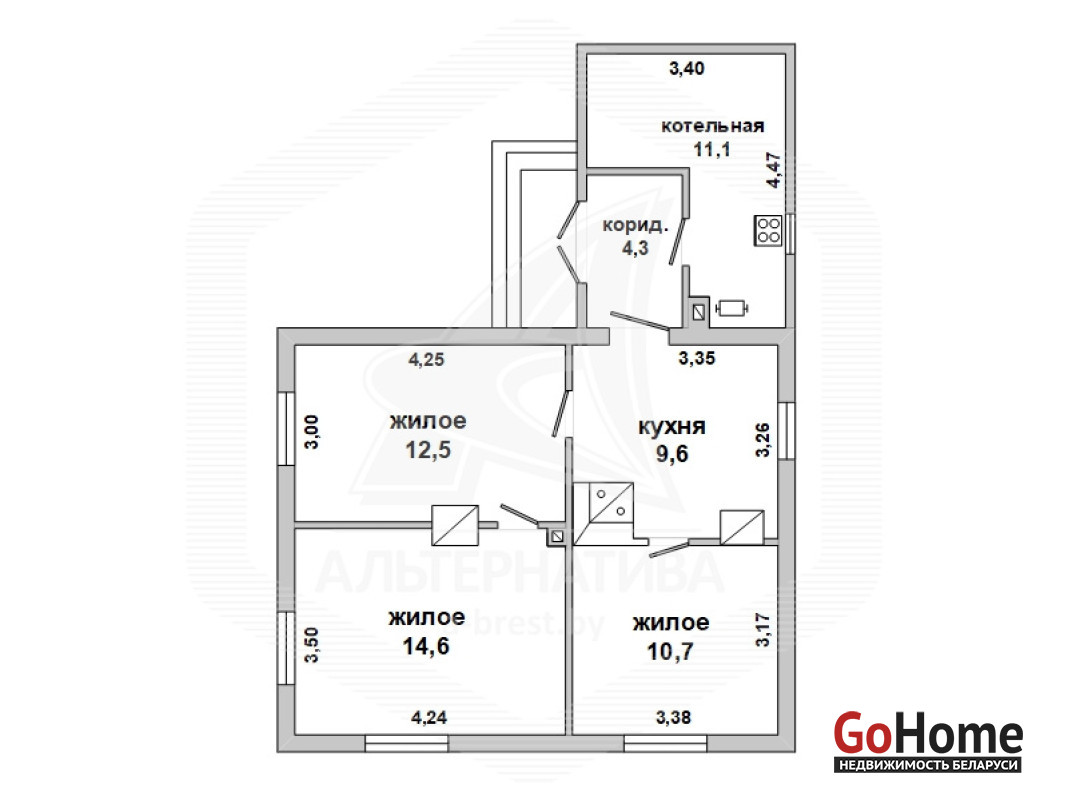 Жилой дом в г.Бресте. 1963 г.п., реконструкция 2006 г. 1 этаж. Общ.СНБ - 62,8 кв.м, общ.- 62,8 кв.м, жил.- 37,8 кв.м, кух.- 9,6 кв.м. 3 комнаты, потолки - 2,6 м.