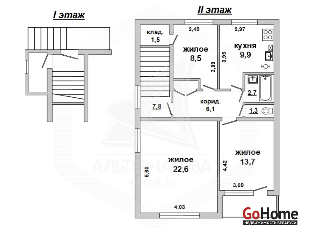 Квартира в блокированном жилом доме в Кобринском р-не. 1973 г.п. 2 этаж 2-х этажного дома. Общ.СНБ - 75,1 кв.м, жил.- 44,8 кв.м, кух.- 9,9 кв.м. 3 комнаты.