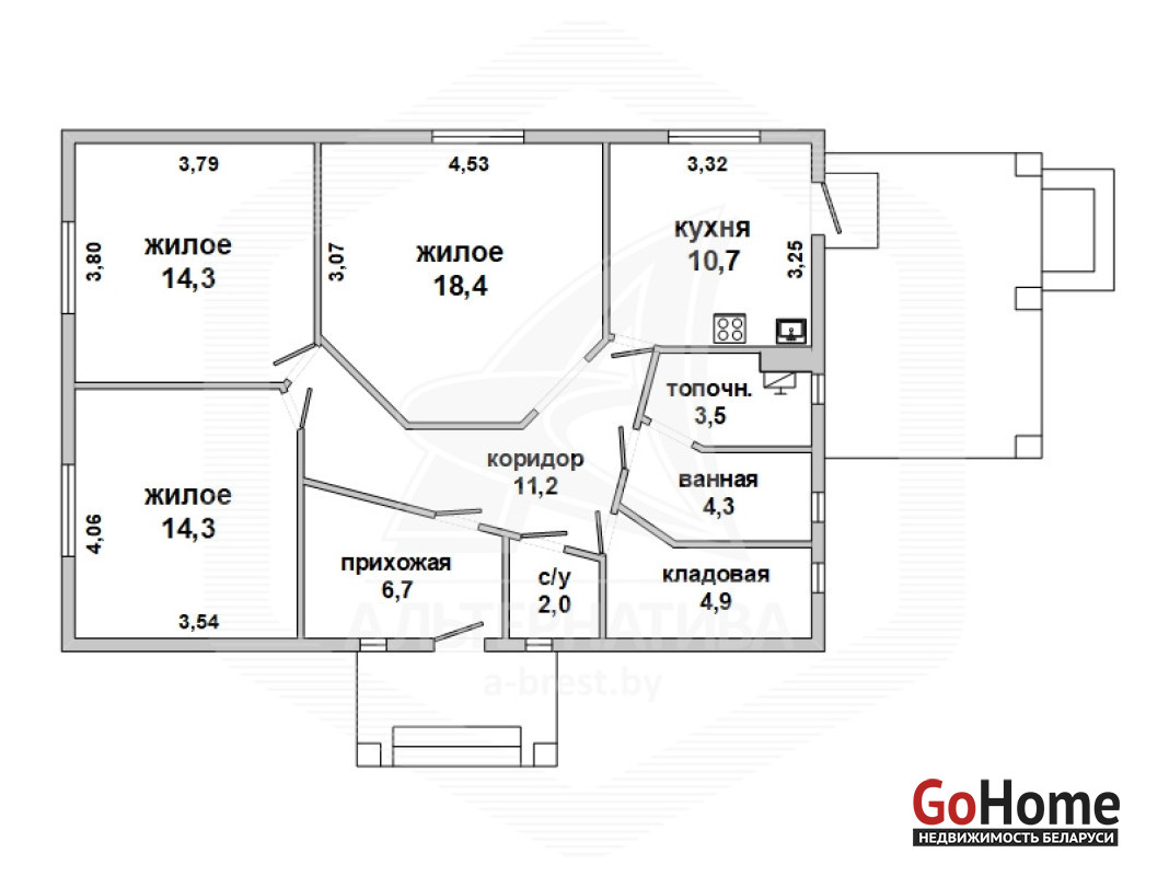 Жилой дом в Кобринском р-не. 2014 г.п. 1 этаж. Общ.СНБ - 95,4 кв.м, общ.- 90,3 кв.м, жил.- 47,0 кв.м. 4 комнаты, высота потолка - 2,8 м.