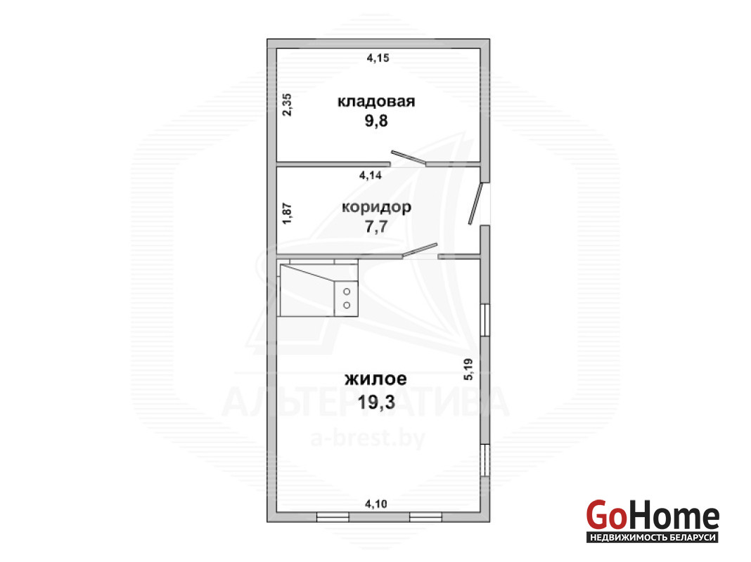 Жилой дом в Жабинковском р-не. 1935 г.п. 1 этаж. Общ.СНБ - 36,8 кв.м, общ.- 36,8 кв.м, жил.- 19,3 кв.м. 1 комната.