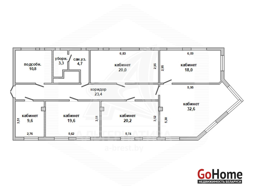 Административное помещение в собственность в центре города Бреста общей площадью 162,2 кв.м. Изолированное помещение расположено на 4 (четвертом) этаже административно - торгового комплекса 2014 года постройки, расположенного на главной пешеходной улице города. Состоит из 7 (семи) помещений разной площади (9,6 + 19,6 + 20,2 + 32,6 + 18 + 20 + 10,8 кв.м). Подсобное помещение - 3,3 кв.м, отдельный санузел - 4,7 кв.м. Технические характеристики помещения: полы - плитка, стены оштукатурены, окрашены, окна, двери - ПВХ. Установлены кондиционеры, оборудована приточно - вытяжная вентиляция, пожарная сигнализация. Индивидуальные приборы учета электроэнергии и водоснабжения. Рассматриваются все варианты. Лот - 181784