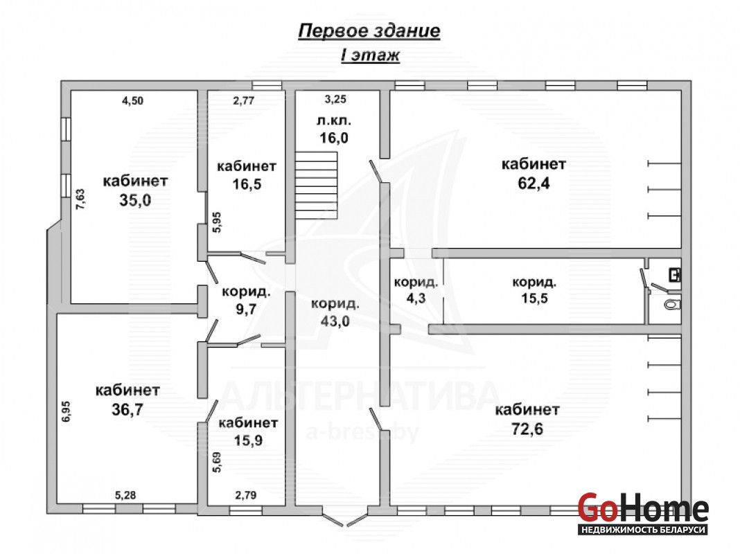 Административно - торговое здание в самом центре города Пинска Брестской области общей площадью 655,1 кв.м. Отдельно стоящее двухэтажное капитальное строение 2016 года реконструкции. 1 этаж: 6 кабинетов разной площади (72,6 + 62,4 + 16,5 + 35 + 36,7 + 15,9 кв.м), коридор, отдельный санузел. Высота потолков - 2,94 м. 2 этаж: 13 кабинетов разной площади (36,7 + 18,6 + 24,5 + 25,6 + 24 + 25,4 + 14,6 + 18,9 + 14,9 + 16,2 + 17,3 + 22,1 + 10,2 кв.м), коридор, отдельный санузел. Технические характеристики здания: фундамент бутовый ленточный, полы - плитка, стены кирпичные, перекрытия ж/бетонное, крыша фальцевая с полимерным покрытием, окна, двери - ПВХ. Все центральные коммуникации (электричество, водоснабжение, канализация), собственная газовая котельная. Доля земельного участка предоставлена собственнику в долгосрочную аренду (до 02.12.2043 года) для обслуживания здания. Здание сдано в аренду, приносит стабильный доход и рассматривается как продажа действующего бизнеса по сдаче в аренду помещений. Лот - 181221
