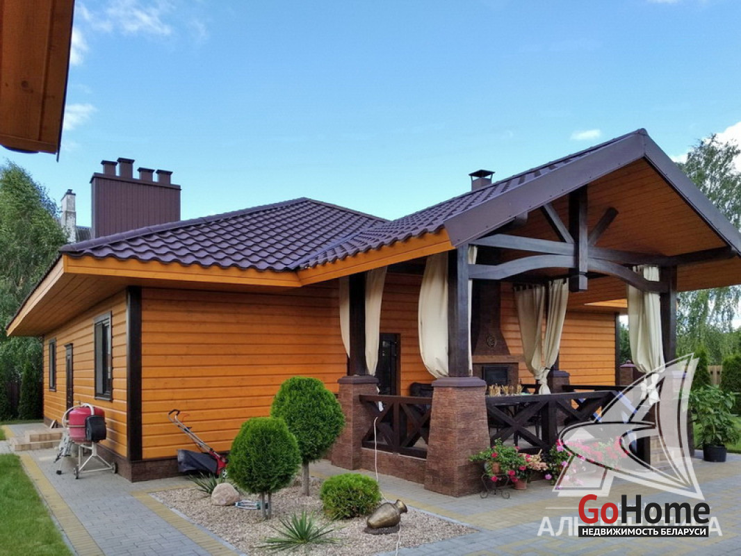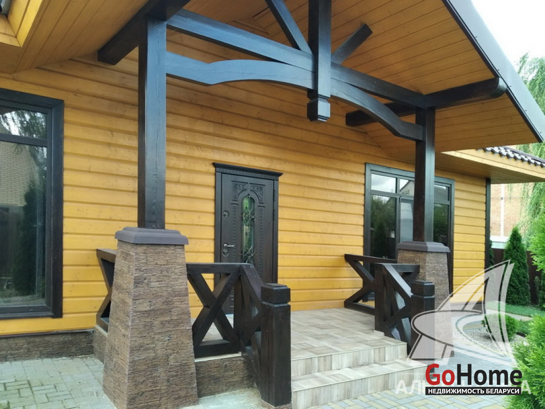 Стены: материал - строительный брус; утепление - минеральная вата; отделка фасада - имитация бруса. Кровля: металлочерепица. Фундамент: ленточный монолитный; материал - бетон; подушка - песчано-гравийная.