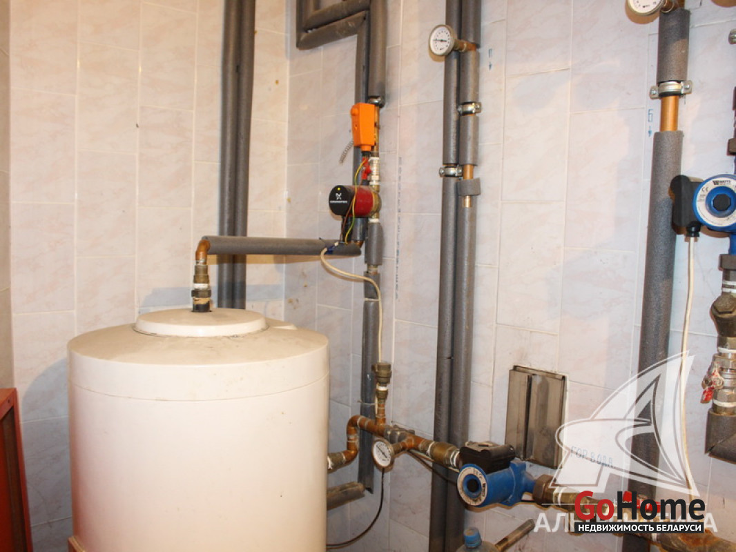 Коммуникации: отопление - газовый котел, газ -централизованный (в доме), водоснабжение - централизованное (по улице) и скважина, электричество - централизованное, канализация - автономная.