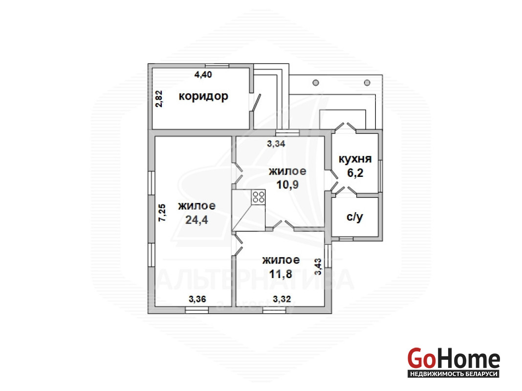 Жилой дом в Жабинковском р-не. 1976 г.п. 1 этаж. Общ.СНБ - 67,5 кв.м, общ.- 46,4 кв.м, жил.- 35,4 кв.м, кух.- 6,2 кв.м. 3 комнаты, высота потолка - 2,7 м.