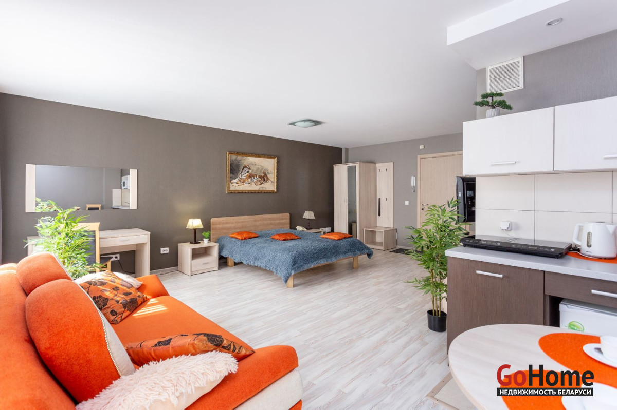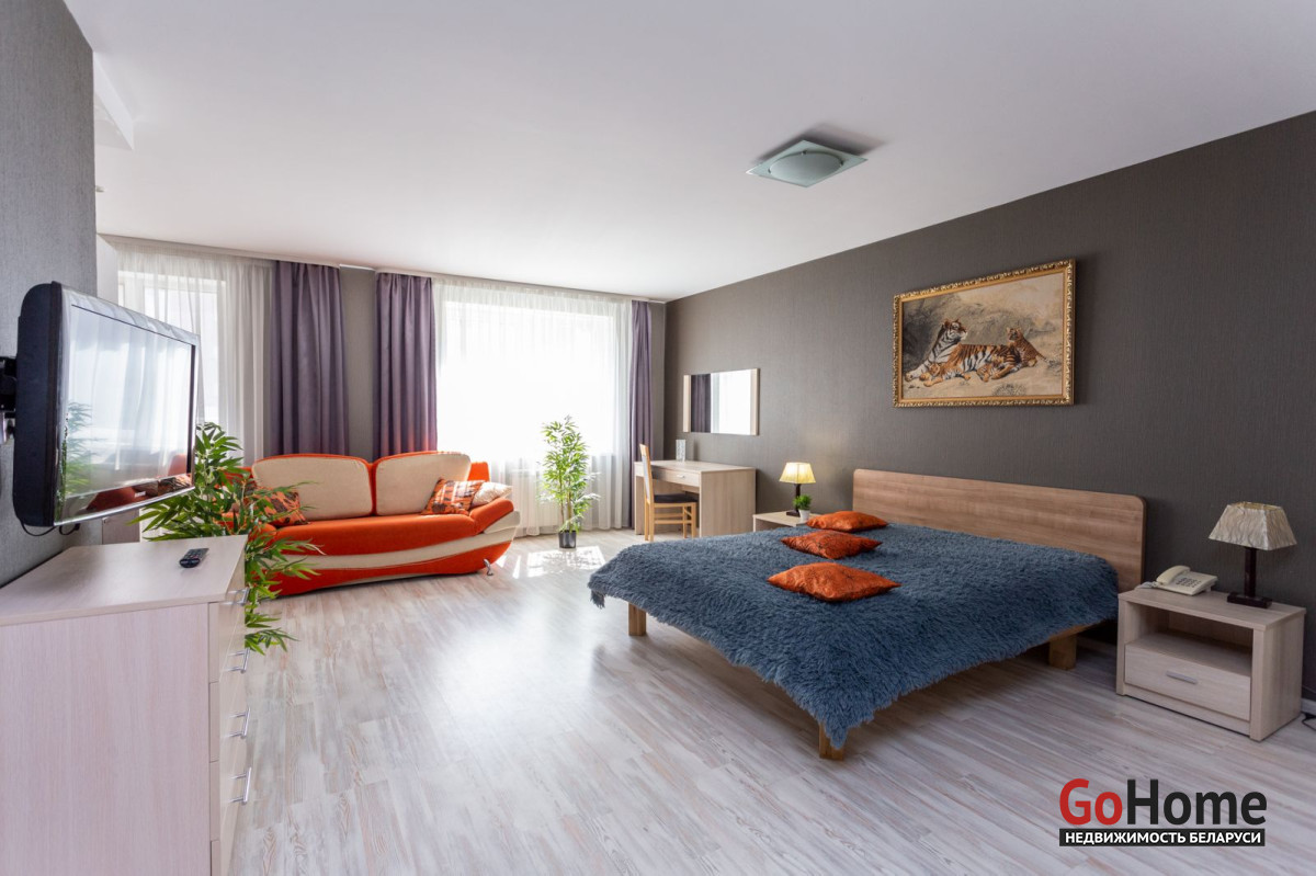 Часы/сутки. Просторная студия. Оборудована всем необходимым: двуспальная кровать, диван, индукционная плита, ТВ, интернет, полотенца, постельное бельё,косметические средства, кофе, чай. Удобное расположение, находится в 5 минутах от ст.м. Грушевка, развитая инфраструктура, рядом Ж/Д вокзал, Немига, пр-т Независимости, диагностический центр, 4ая больница. Квартира рассчитана на проживание максимум трёх человек. Спальные места: 2+1 (семья). Не сдаётся для проведения вечеринок и компаниям. Цена на часы, выходные и праздничные дни договорная.
