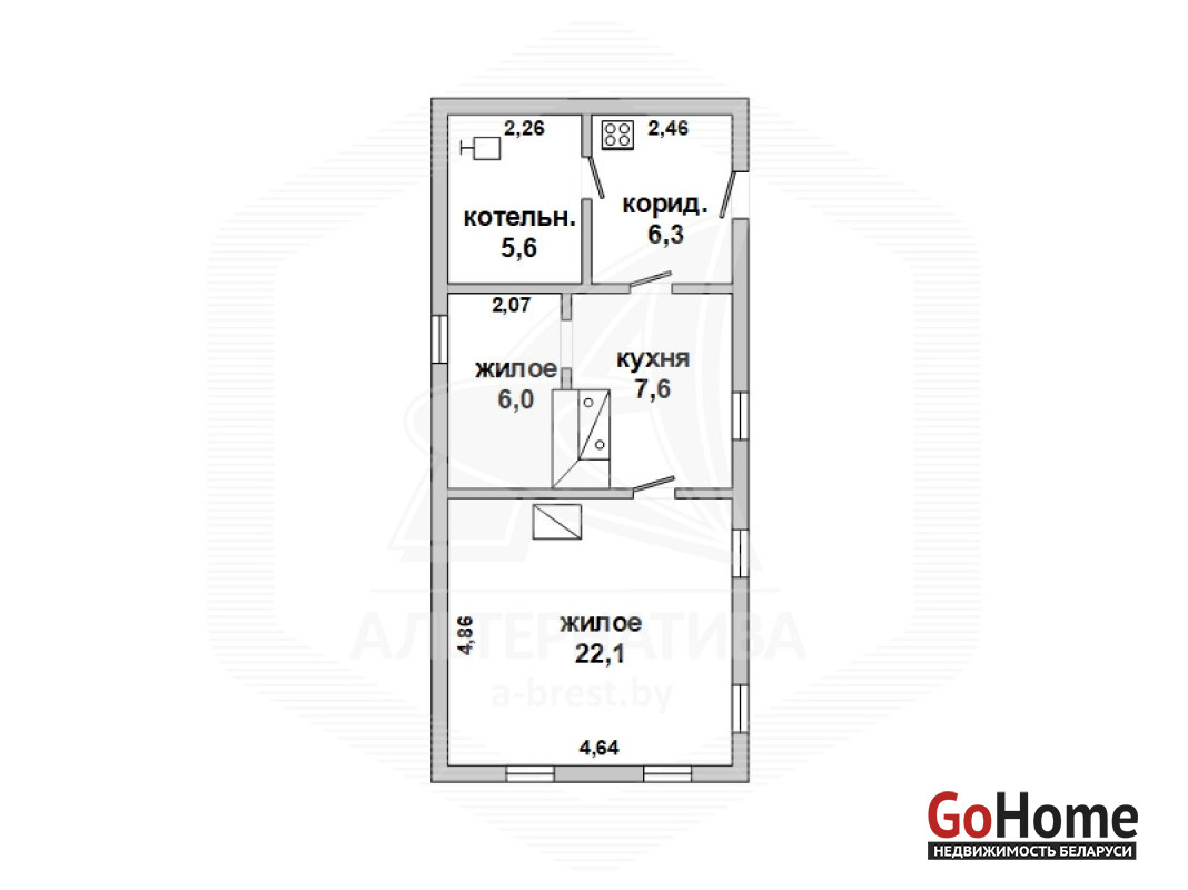 Жилой дом в г.Жабинке. 1918 г.п. 1 этаж. Общ.СНБ - 47,6 кв.м, общ.- 47,6 кв.м, жил.- 28,1 кв.м, кух.- 7,6 кв.м. 2 комнаты, высота потолка - 2,50 м.