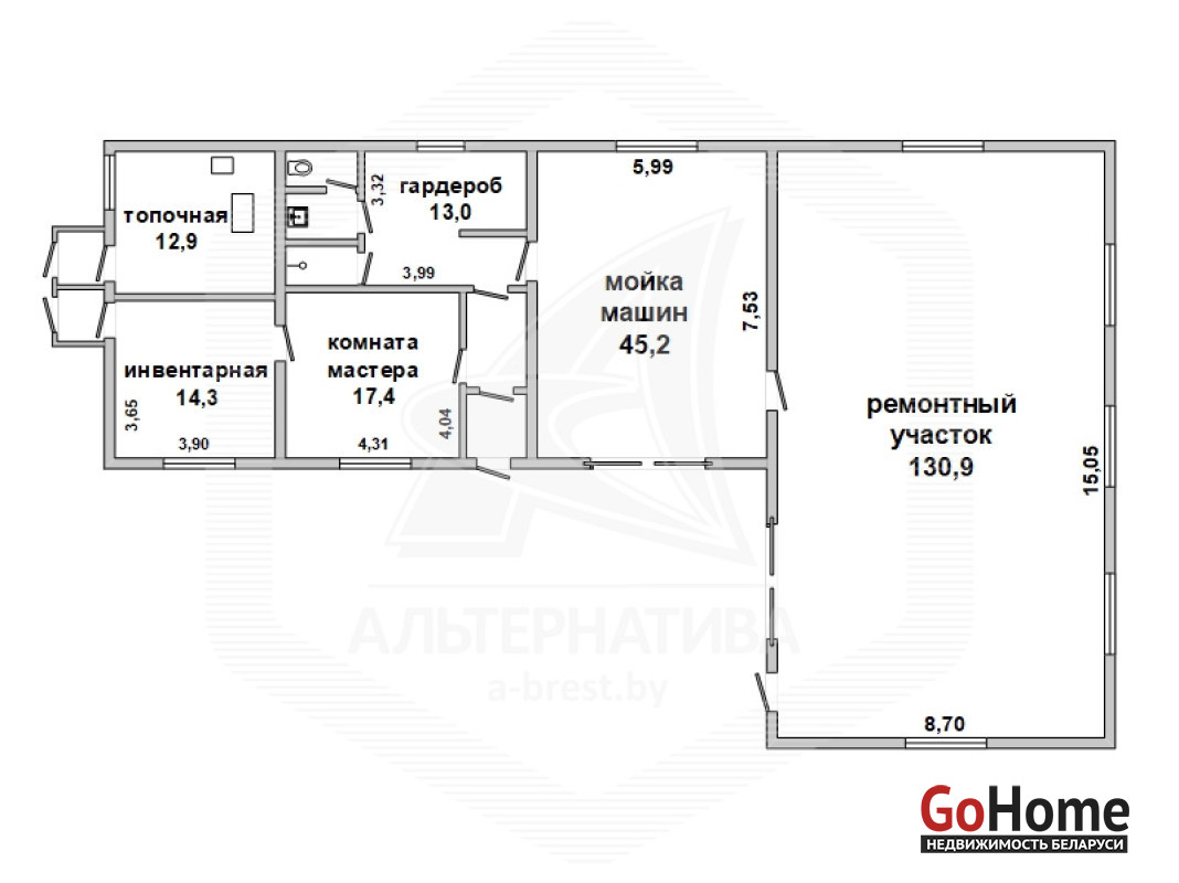 Автосервис (назначение - здание специализированное для ремонта и технического обслуживания автомобилей с мойкой) с оборудованием в собственность в районе ул. Писателя Смирнова города Бреста общей площадью 247 кв.м. Действующий объект с полным комплектом оборудования. Состоит из 2 (двух) изолированных помещений с отдельным входом (въездом) каждое: 1) Ремонтная зона площадью 130,9 кв.м. Высота потолков - 4,30 м. 2) Мойка машин площадью 45,2 кв.м. Высота потолков - 3,01 м. В здании есть помещение для магазина запчастей (17,4 кв.м), подсобное помещение (14,3 кв.м), гардероб (13 м), отдельный санузел, собственная газовая топочная. Технические характеристики здания: фундамент бетонный, полы бетонные, наливные, плитка, стены блочные, кирпичные, перекрытия ж/бетонные панели, крыша металлическая. В здании оборудована приточно-вытяжная вентиляция, пожарная сигнализация, проведено видеонаблюдение. Все центральные коммуникации: электричество - 220, 380 Вт (входная мощность до 25 кВт), газовое отопление (собственная топочная), водоснабжение центральное, канализация центральная. Земельный участок площадью 0,0706 га предоставлен собственнику в долгосрочную аренду (до 09.08.2061 г.) для обслуживания автосервиса. Прилегающая территория асфальтирована, огорожена забором. Асфальтные подъездные пути. В стоимость входит все оборудование, находящееся в автосервисе (в т.ч. 3 (три) подъемника (2 на 3,5 т, 1 на 4 т), развал - схождение 3D, моечный аппарат, разнообразные наборы ключей, мебель и т.д). Варианты аренды автосервиса НЕ РАССМАТРИВАЮТСЯ. Контактный телефон (029)202-66-19 (Александр Александрович) Лот - 210543