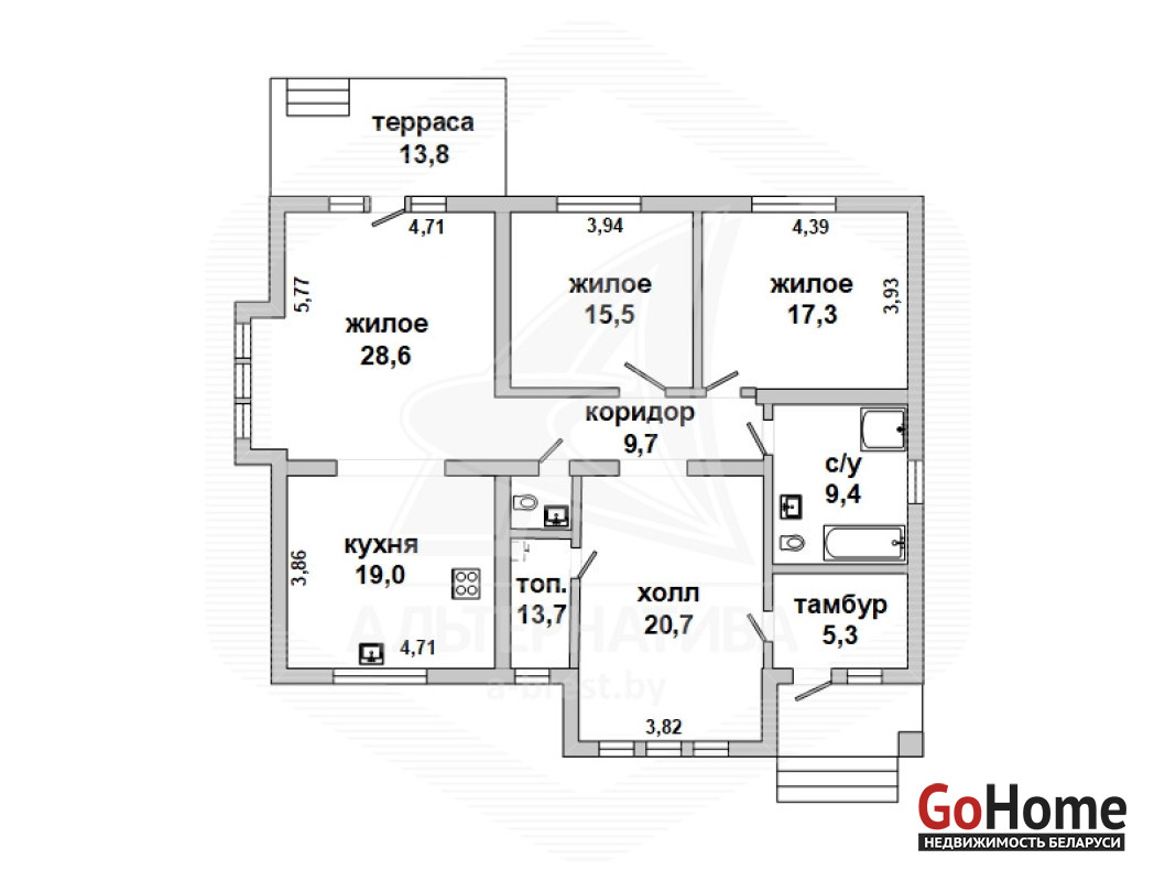 Жилой дом в г.Бресте. 2015 г.п. 1 этаж. Общ.СНБ - 134,3 кв.м, общ.- 130,5 кв.м, жил.- 61,4 кв.м, кух.- 19,0 кв.м. 3 комнаты.