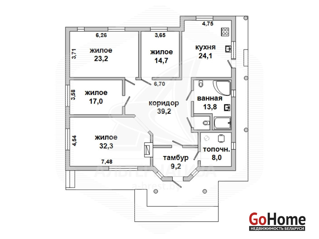 Жилой дом в Жабинковском р-не. 2020 г.п. 1 этаж. Общ.СНБ - 191,4 кв.м, общ.- 183,7 кв.м, жил.- 87,2 кв.м, кух.- 24,1 кв.м. 4 комнаты, высота потолка - 2,8 м.