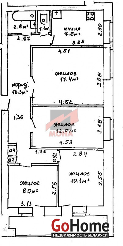 Площади: 75,8/47,5/7,8 м2, комнаты все изолированные: 17,4+12+10,1+8 м2.