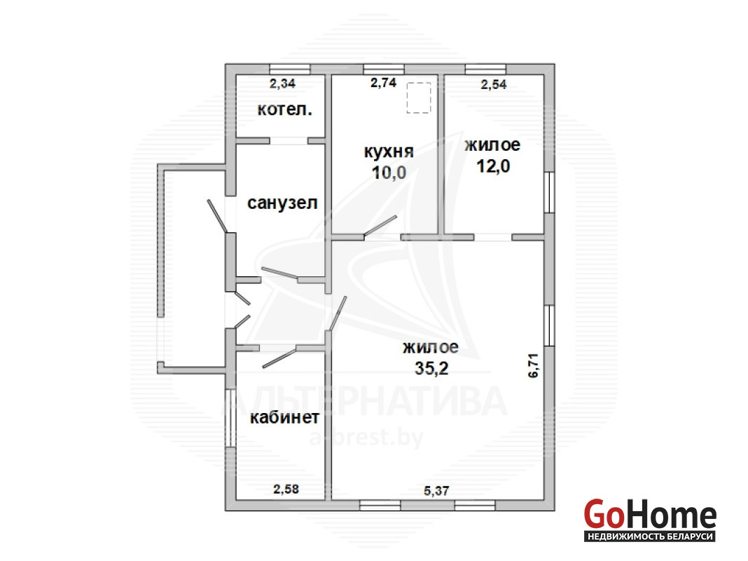 Жилой дом в Брестском р-не. 1956 г.п. 1 этаж. Общ.СНБ - 83,1 кв.м, общ.- 56,7 кв.м, жил.- 45,6 кв.м, кух.- 10,0 кв.м. 3 комнаты, высота потолка - 2,4 м.