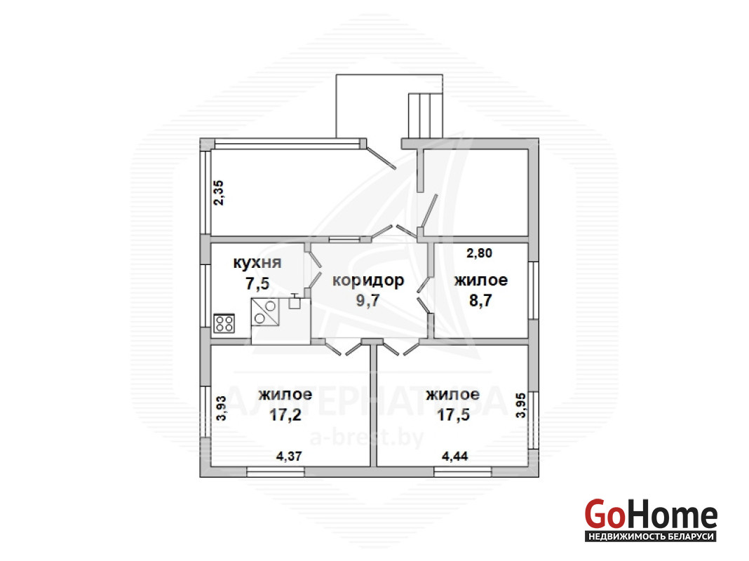 Жилой дом в Брестском р-не. 1988 г.п. 1 этаж. Общ.СНБ - 79,1 кв.м, общ.- 60,6 кв.м, жил.- 43,4 кв.м, кух.- 7,5 кв.м. 3 комнаты, высота потолка - 2,85 м.