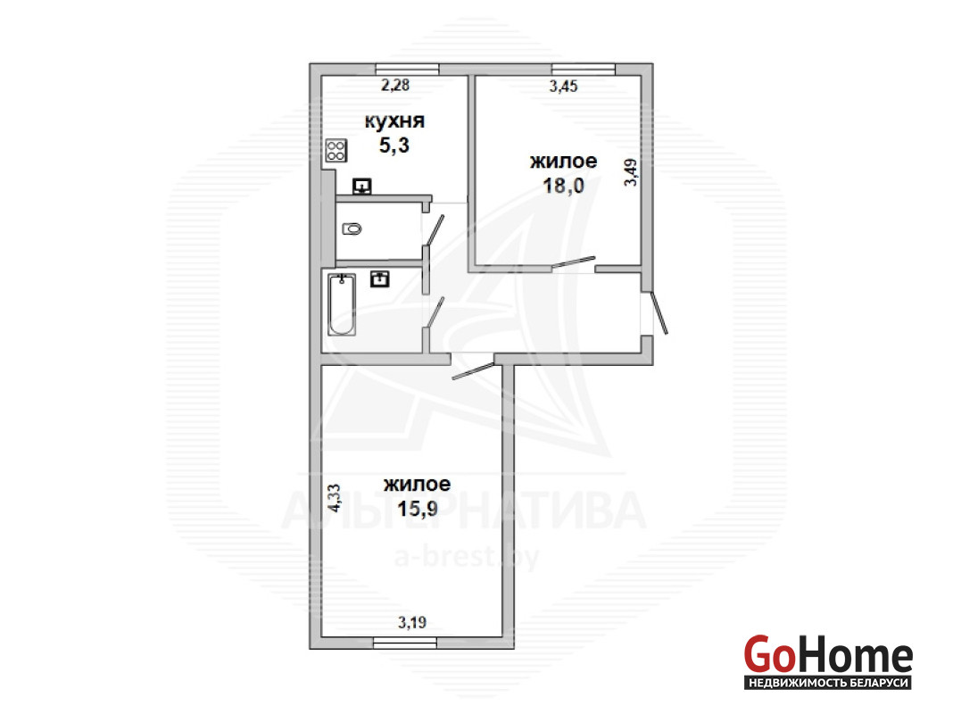 2-комнатная квартира, г. Брест, ул. Гоголя, 1958 г.п., 1 / 3 кирпич, 44,8 / 44,8 / 27,9 / 5,3, санузел раздельный, подвал, стеклопакеты, полы - доска крашеная, потолки - 2,85 м, домофон. Квартира в жилом состоянии. Возможен вывод в нежилой фонд. Лот - 212514