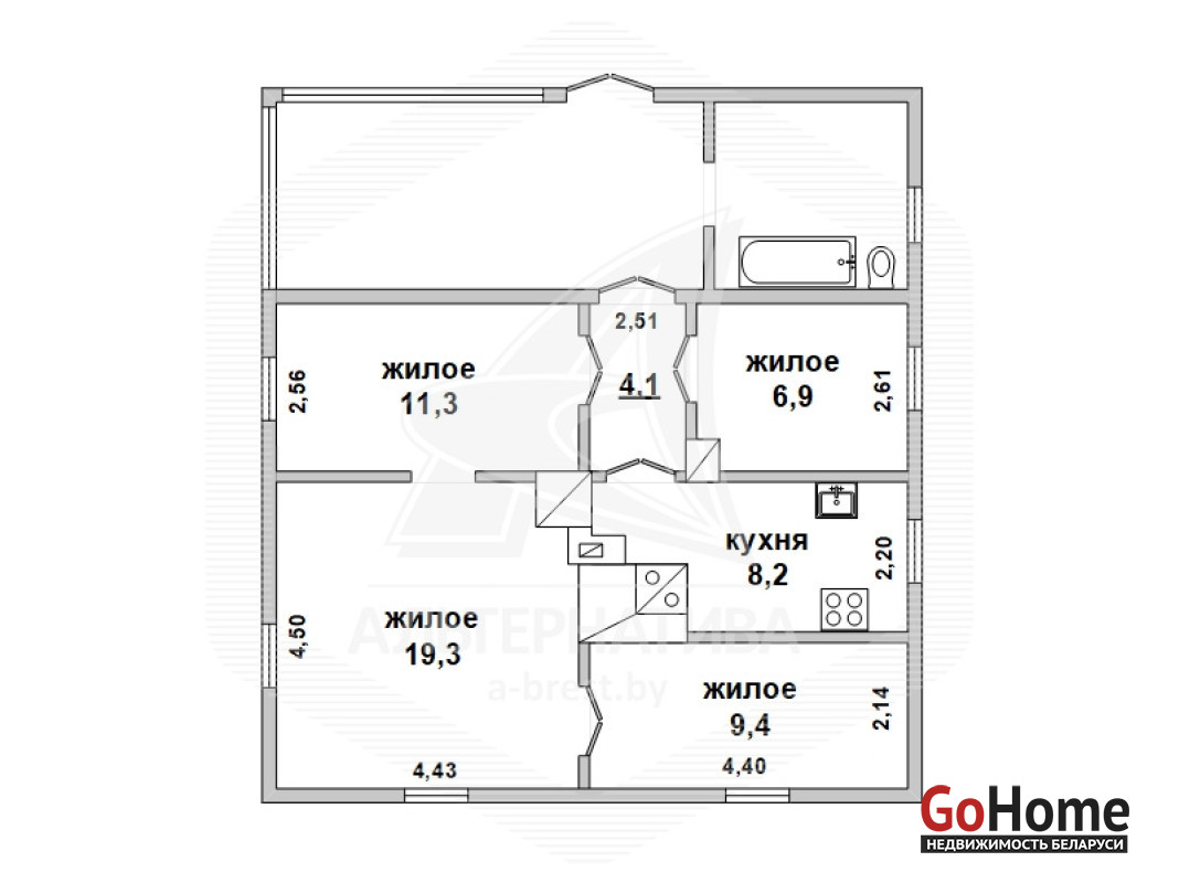 Жилой дом в Брестском р-не. 1 этаж. Общ.СНБ - 76,1 кв.м, общ.- 59,1 кв.м, жил.- 46,8 кв.м, кух.- 8,2 кв.м. 4 комнаты, высота потолка - 2,75 м.
