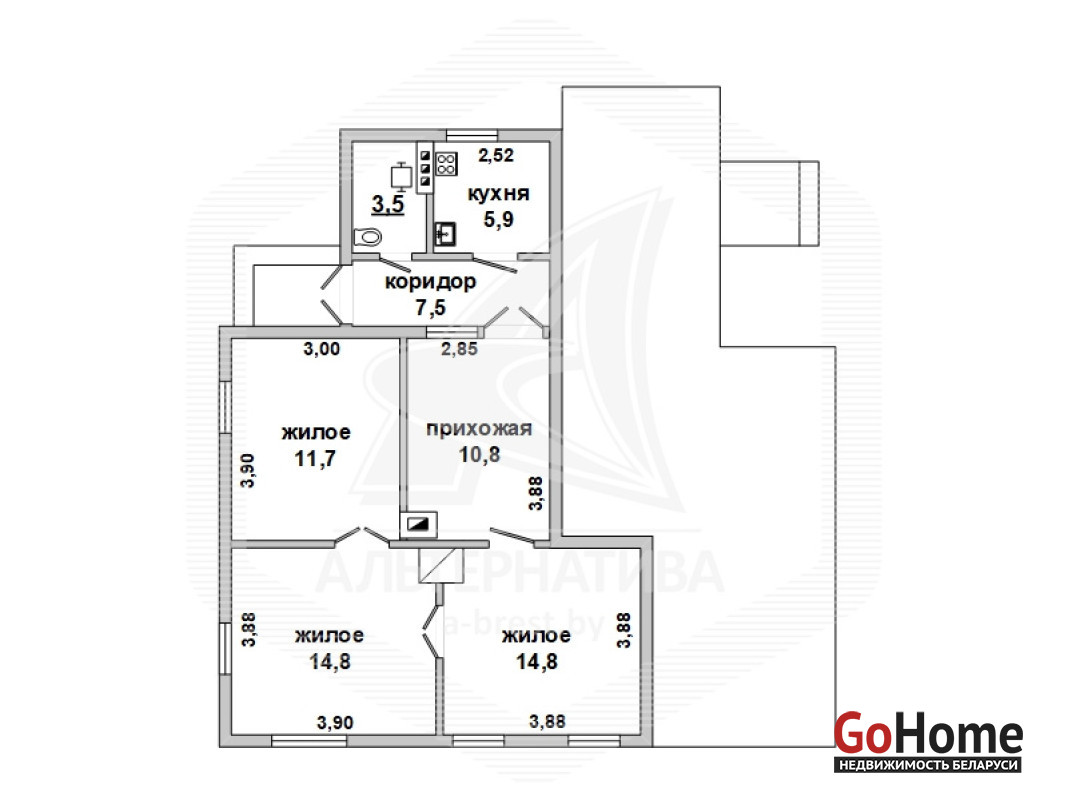 Тех. хар-ка продаваемой части дома: 3 комнаты, общ.СНБ - 68,3 кв.м, общ.- 68,3 кв.м, жил.- 37,9 кв.м, кух.- 5,9 кв.м.