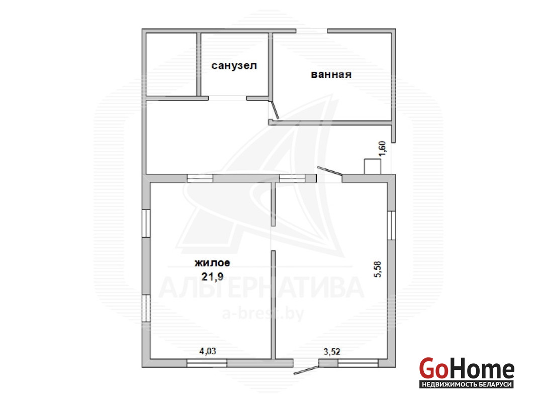 Жилой дом в Кобринском р-не. 1965 г.п. Реконструкция 2019 г.1 этаж. Общ.СНБ - 39,6 кв.м, общ.- 39,6 кв.м, жил.- 21,9 кв.м, кух.~ 14,0 кв.м. 2 комнаты, высота потолка - 2,70 м.