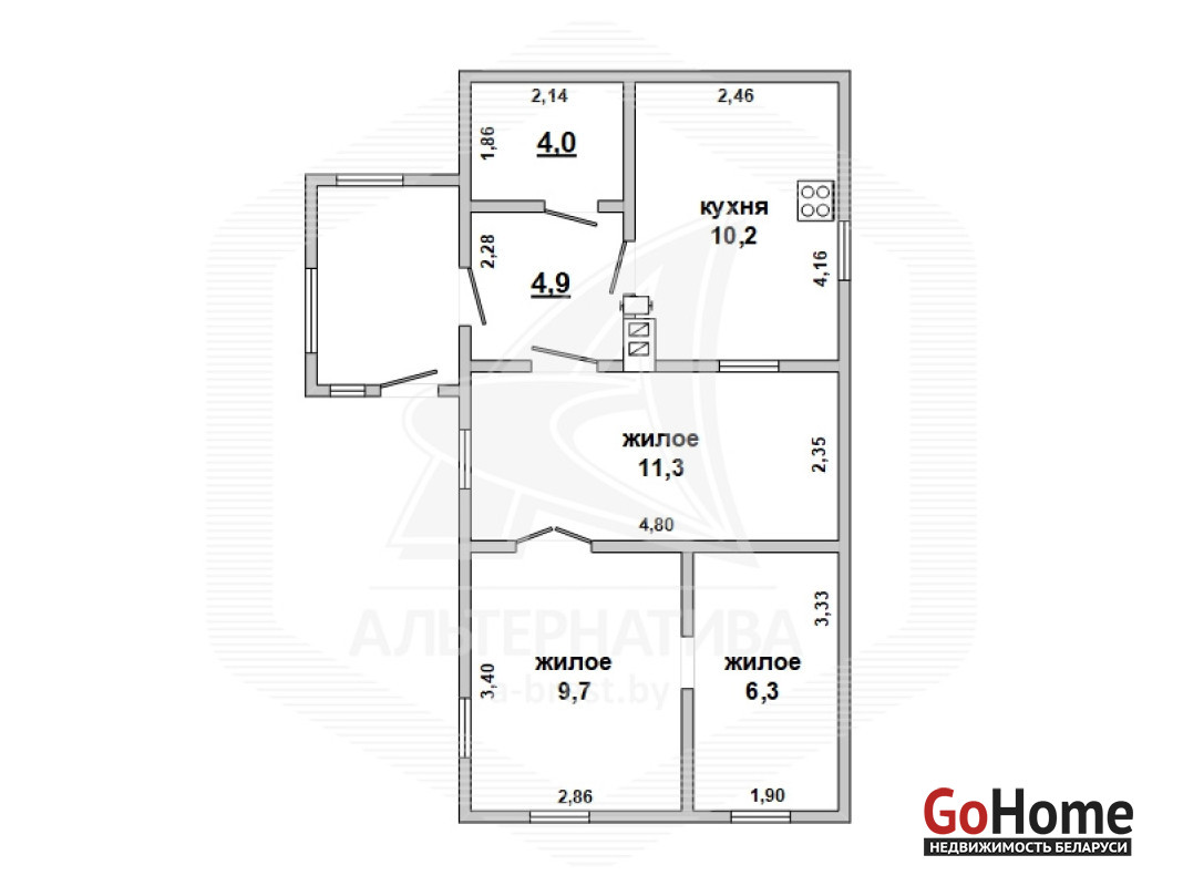 Жилой дом в г.Бресте. 1935 г.п. 1 этаж. Общ.СНБ - 51,9 кв.м, общ.- 46,2 кв.м, жил.- 27,3 кв.м, кух.- 10,2 кв.м. 2 комнаты, потолки - 2,50 м.