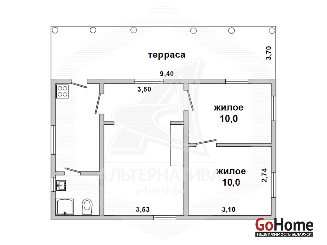 Агроусадьба в Каменецком р-не. 1948 г.п. 1 этаж. Общ.СНБ - 72,48 кв.м, общ.- 42,80 кв.м, жил.- 37,70 кв.м, кух.- 7,20 кв.м. 3 комнаты, высота потолка - 2,40 м.