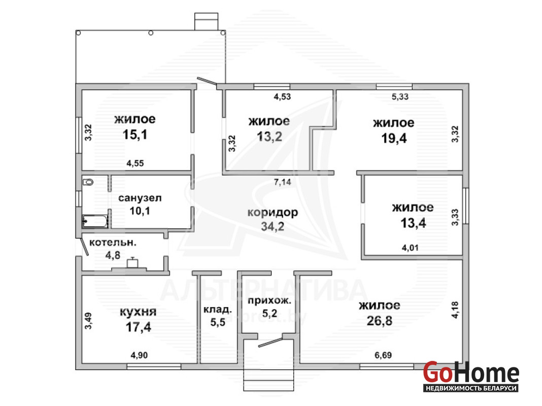 Жилой дом в Брестском р-не. 2014 г.п. 1 этаж. Общ.СНБ - 169,3 кв.м, общ.- 165,1 кв.м, жил.- 87,9 кв.м, кух.- 17,4 кв.м. 5 комнат.