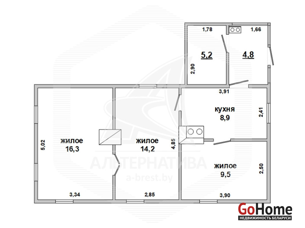 Жилой дом в Брестском р-не. 1953 г.п. 1 этаж. Общ.СНБ - 58,9 кв.м, общ.- 48,9 кв.м, жил.- 40,0 кв.м, кух.- 8,9 кв.м. 3 комнаты, высота потолка - 2,5 м.