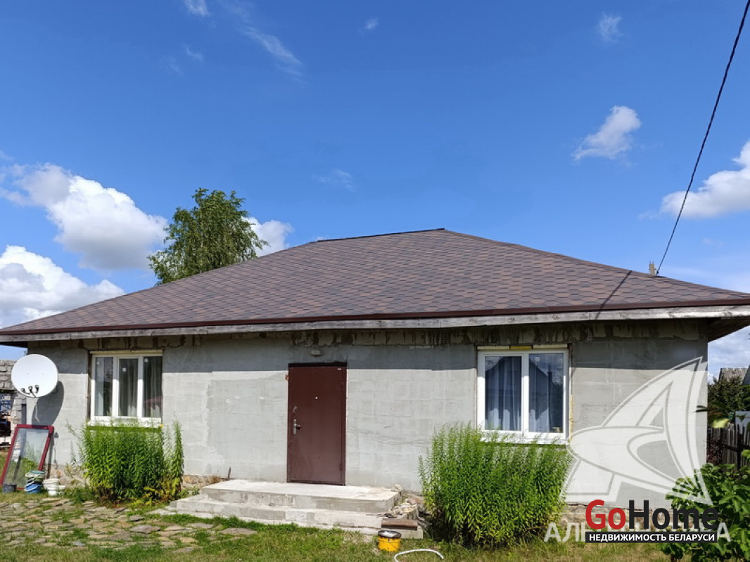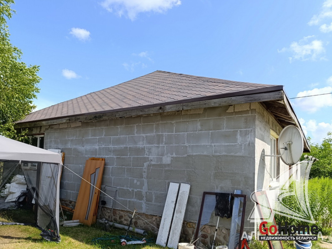Стены: материал - газосиликатный блок; отделка фасада - оштукатурен. Кровля: мягкая битумная черепица. Фундамент: ленточный монолитный; материал - бетон; подушка - песчано-гравийная.