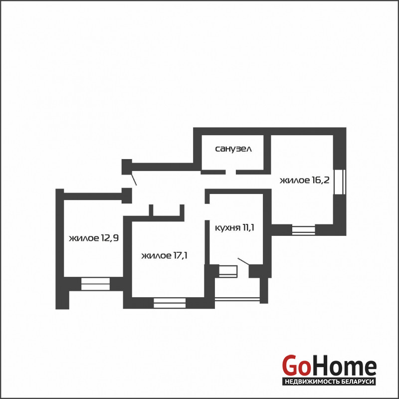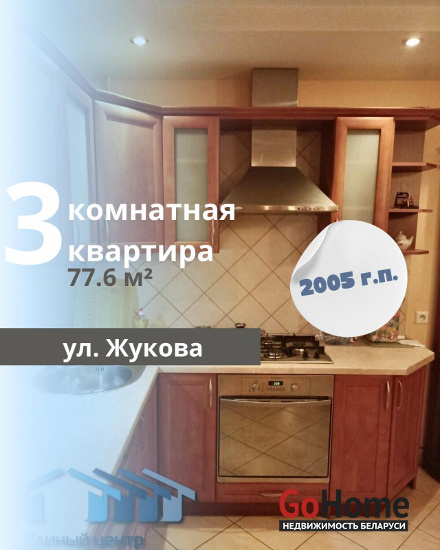 3-комнатная квартира по ул. Жукова. Общая площадь 77,6 кв.м., жилая 46,2 кв.м., кухня 11,1 кв.м. Квартира расположена на третьем этаже пятиэтажного кирпичного дома 2005 года постройки.