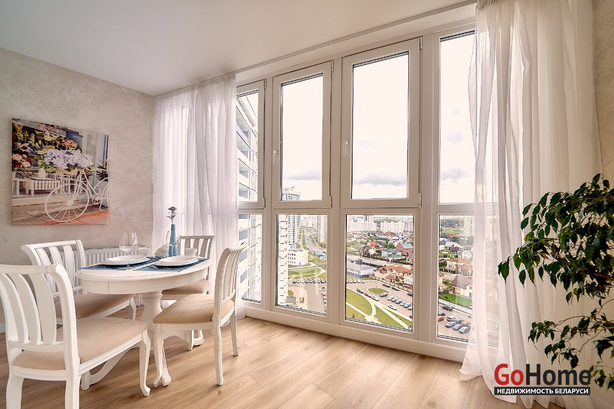 Французские Панорамные окна с потрясающим видом на "чешскую деревню" коттеджную застройку с высоты высокого 14 этажа. Стены лоджии выполнены дорогой Итальянской декоративной штукатуркой , в спокойном стиле , подогрев полов . Окна квартиры выходят в уютный тихий двор , где нет постороннего шума и отрицательных эмоций . Особенно прекрасен вид в ночное время, создается романтическая атмосфера.