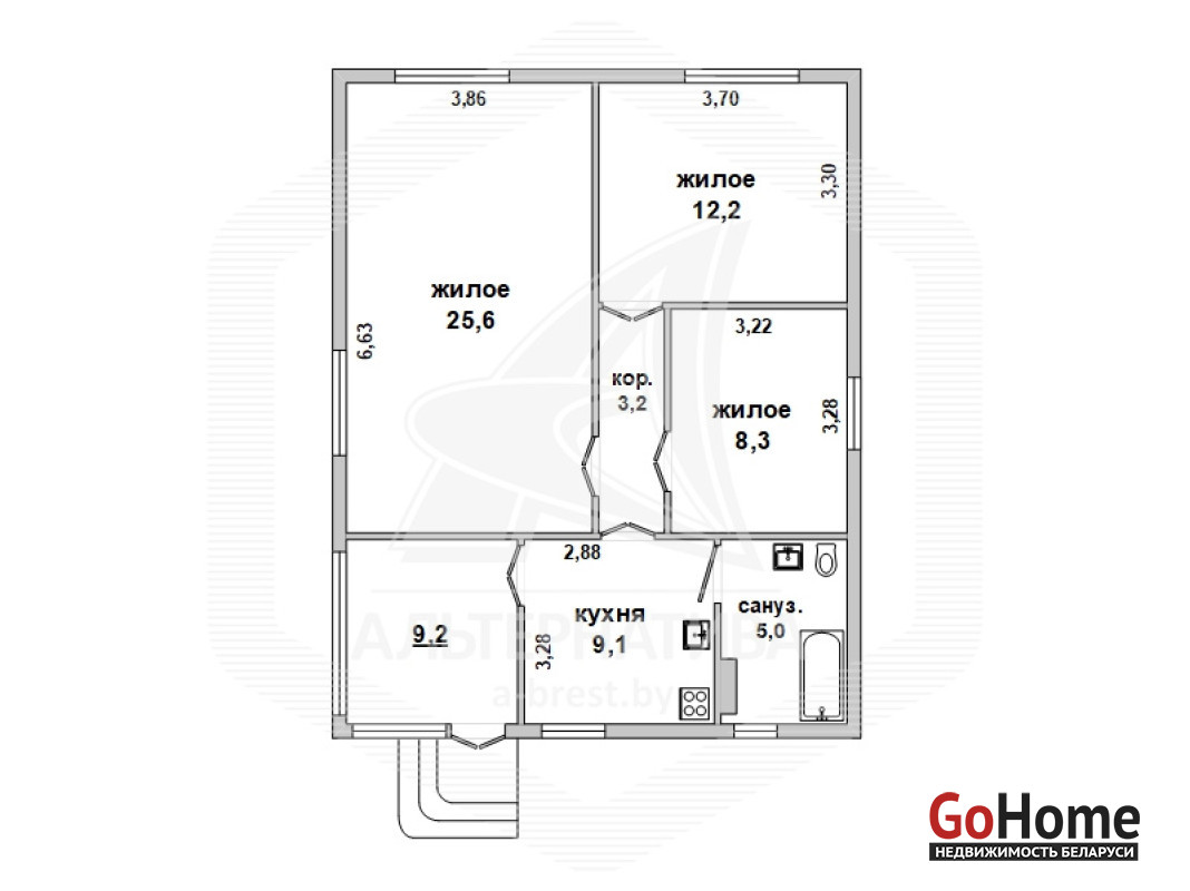 Жилой дом в г.Бресте. 1975 г.п. 1 этаж. Общ.СНБ - 72,6 кв.м, общ.- 63,4 кв.м, жил.- 46,1 кв.м, кух.- 9,1 кв.м. 3 комнаты.