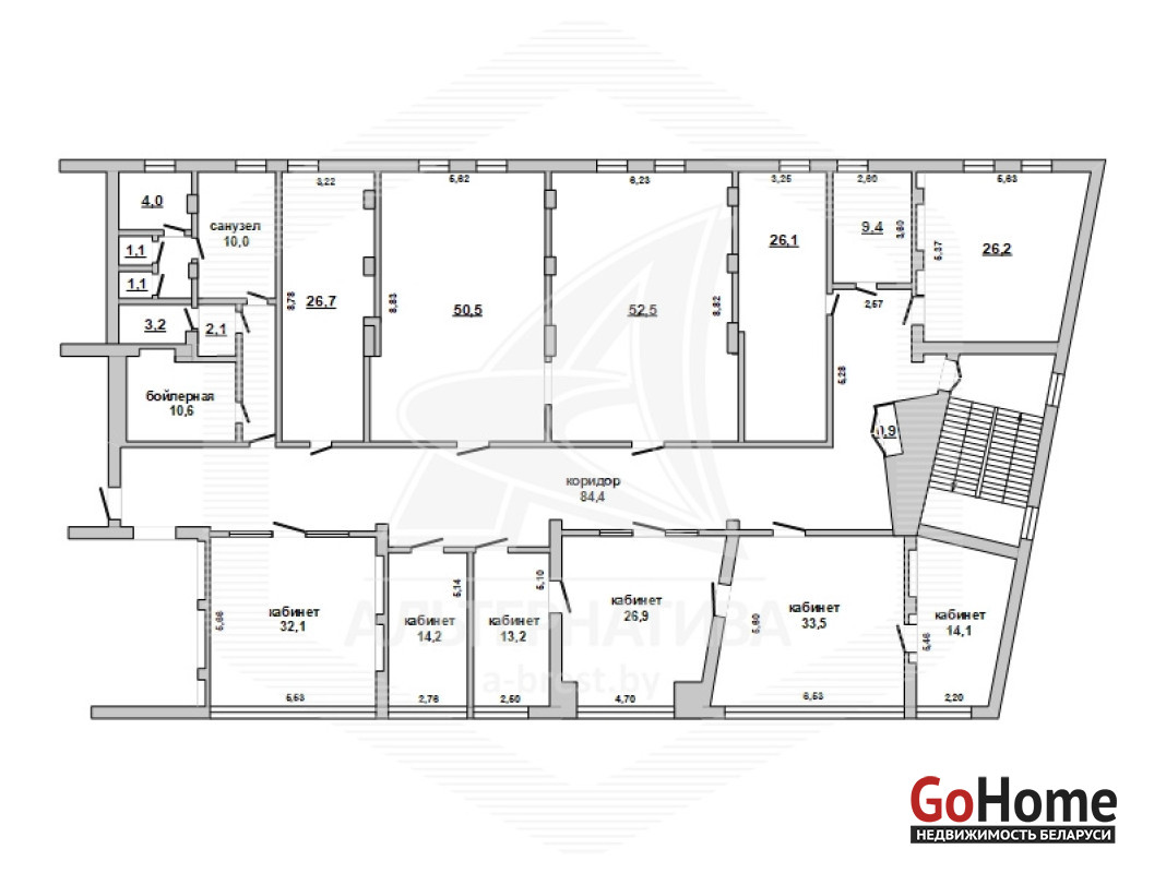 Административное помещение в собственность в центре города Бреста общей площадью 467,6 кв.м. Изолированное помещение расположено на 4 (четвертом) этаже административно - торгового комплекса, расположенного на главной пешеходной улице города. Состоит из 12 (двенадцати) кабинетов разной площади (14,1 + 33,5 + 26,9 + 13,2 + 14,2 + 32,1 + 26,7 + 50,5 + 52,5 + 26,1 + 9,4 + 26,2 кв.м). Коридор, подсобные помещения, комната приема пищи, несколько отдельных санузлов. Технические характеристики помещения: полы - плитка, стены оштукатурены, окрашены, окна, двери - ПВХ. Оборудована пожарная сигнализация, установлены индивидуальные приборы учета электроэнергии и водоснабжения, кондиционеры, проведено оптоволокно. Цена указана с НДС. Рассматриваются все варианты. Лот - 223500