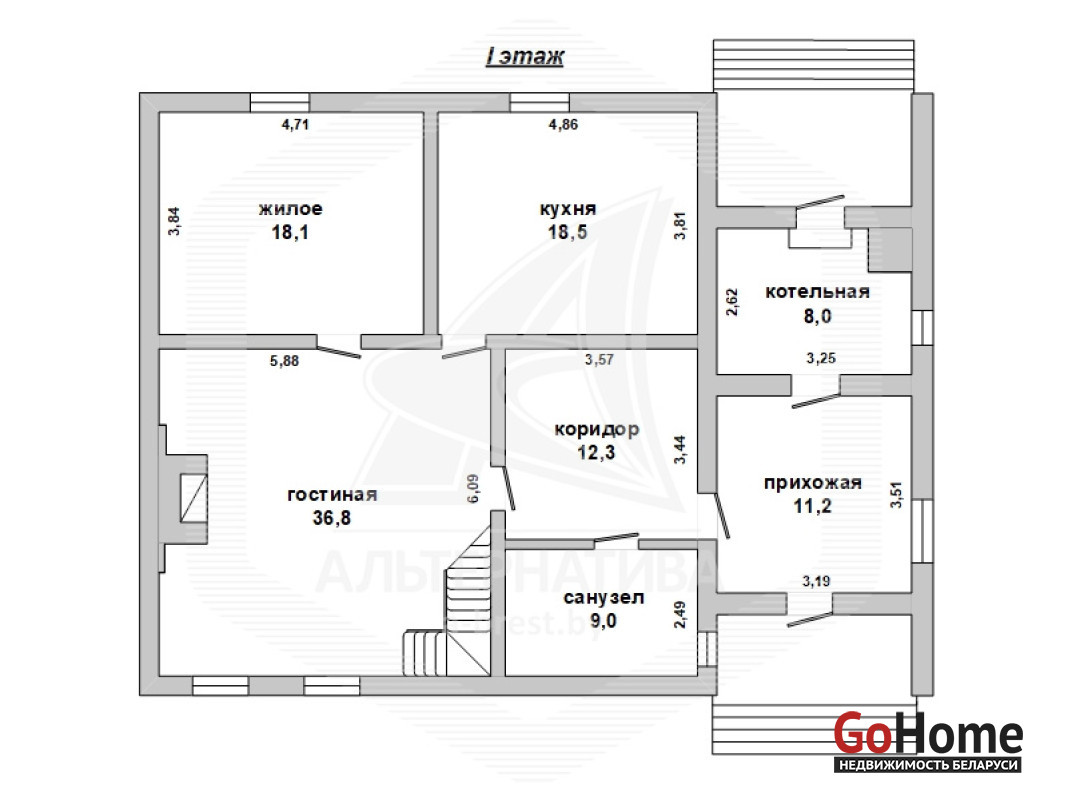 Жилой дом в Каменецком р-не. 2009 г.п. 1 этаж, мансард. Общ.СНБ - 201,1 кв.м, общ.- 201,1 кв.м, жил.- 118,6 кв.м, кух.- 18,5 кв.м. 4 комнаты, высота потолка - 2,85 м.