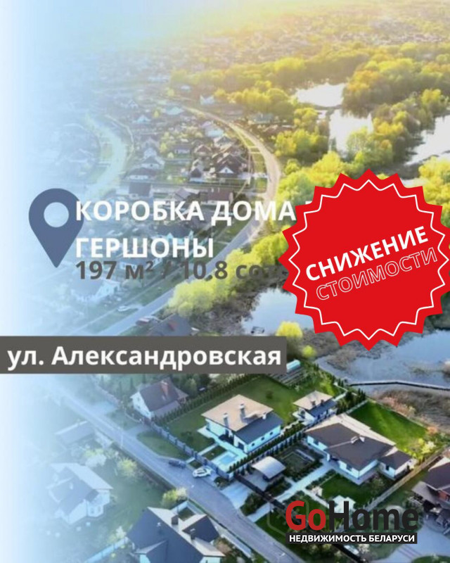 Коробка жилого дома в Гершонах. Общая площадь 197 м2, площадь, жилая 120 м2 (мансардный этаж 88,8 м2), площадь кухни-столовой 37,5 м2. Материалы дома: блок газосиликатный, утеплен и оштукатурен; крыша шифер; фундамент ленточный бетонный; перекрытия деревянные. Установлены окна ПВХ, входные металлические двери, на полу залита черновая стяжка. Участок 10,8 сотки, угловой, огорожен по периметру декоративным забором. На участке так же есть готовый гостевой дом, гараж и баня, барбекю и много садовых деревьев. Коммуникации: электричество на участке (в гостевом доме, гараже и бане); газ по улице, вода скважина/гидрофор; канализация местная, разведена по дому; отопление твердотоплевный котел в гостевом доме. На участке оборудована зона барбекю. Подъездные пути асфальт. Чистейшее озеро в 200 метрах от дома, магазин через дорогу, до остановки общественного транспорта 5 минут ходьбы. Метка на карте указана приблизительно. Точный адрес оглашается при согласовании осмотра.
