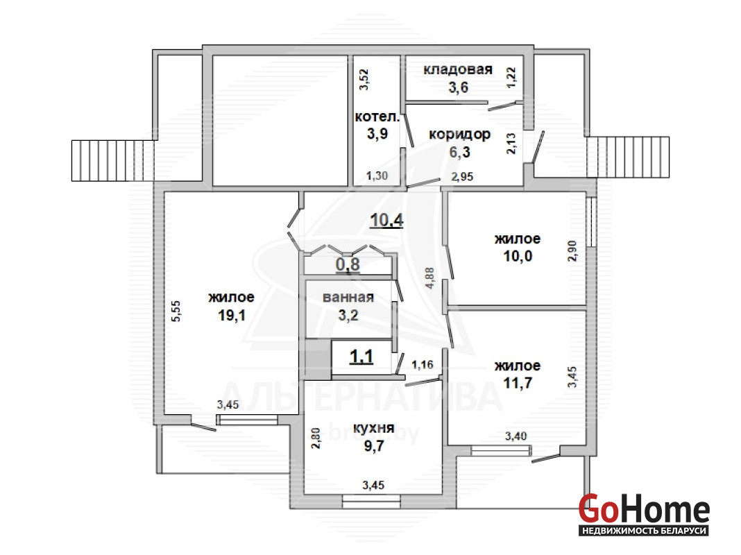 Квартира в блокированном жилом доме в Пружанском р-не. 1993 г.п. 1 этаж. Общ.СНБ - 132,9 кв.м, общ.- 79,8 кв.м, жил.- 40,8 кв.м, кух.- 9,7 кв.м. 3 комнаты.
