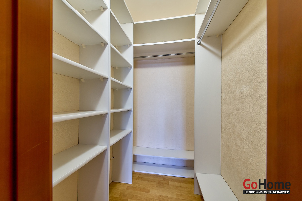 Спальня с двуспальной кроватью, комодом и гардеробной.