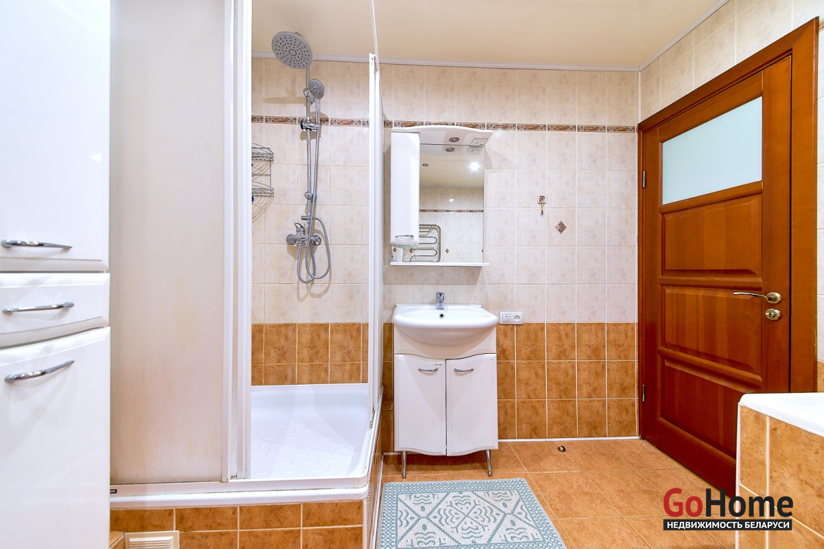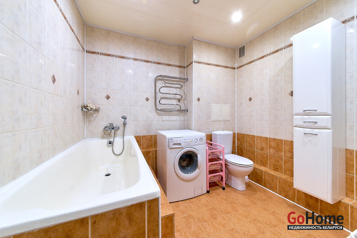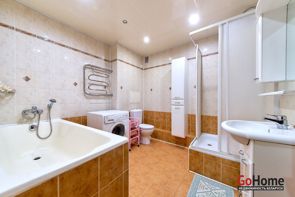 Большой санузел с ванной, душевой кабиной и стильной машиной.
