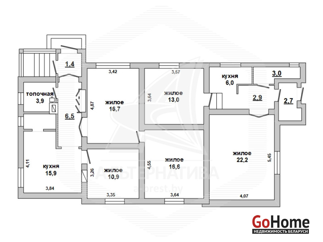 Жилой дом в г.Бресте. 1965 г.п. 1 этаж. Общ.СНБ - 139,0 кв.м, общ.- 120,9 кв.м, жил.- 79,4 кв.м, кух.- 15,9 кв.м. 5 комнат, высота потолка - 2,70 м.