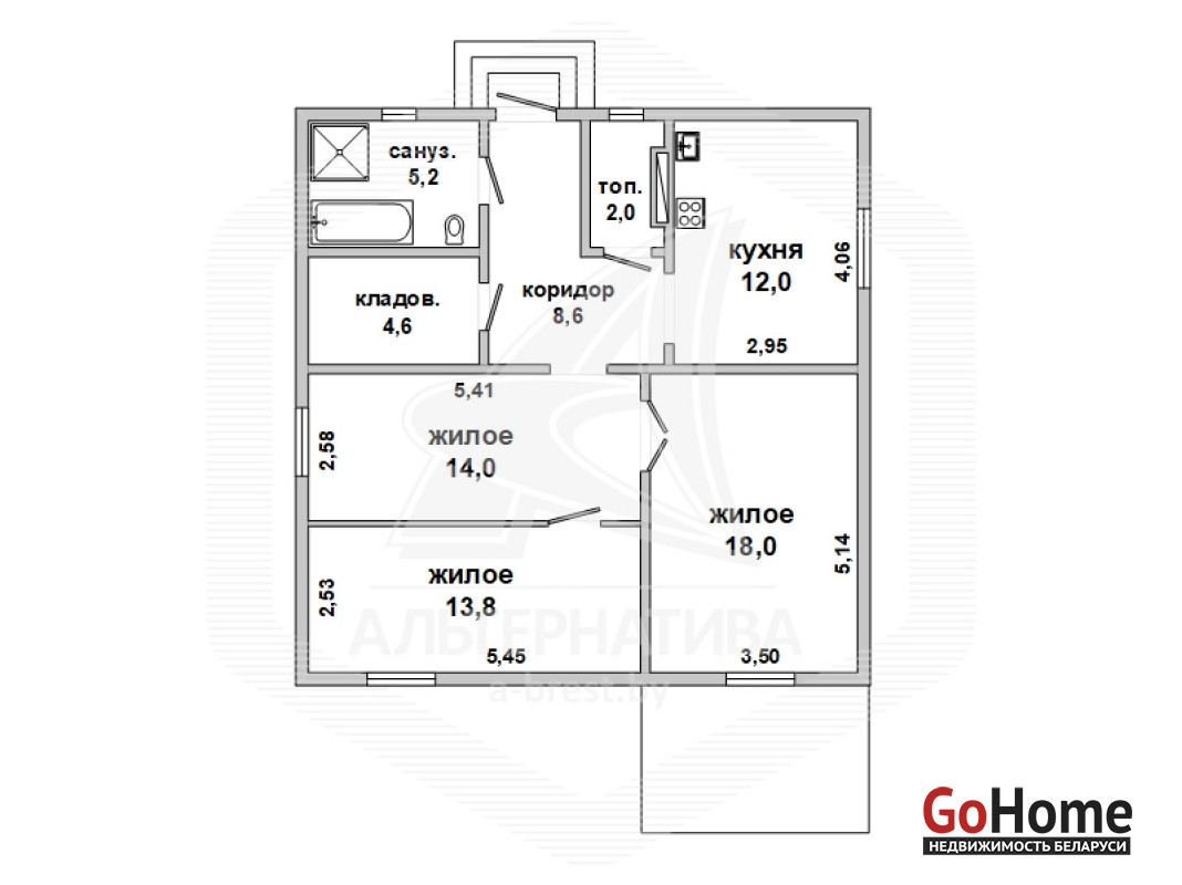 Жилой дом в г.Кобрине. 1947 г.п. 1 этаж, подвал. Общ.СНБ - 78,2 кв.м, общ.- 78,2 кв.м, жил.- 45,8 кв.м, кух.- 12,0 кв.м. 3 комнаты, высота потолка - 2,58 м.