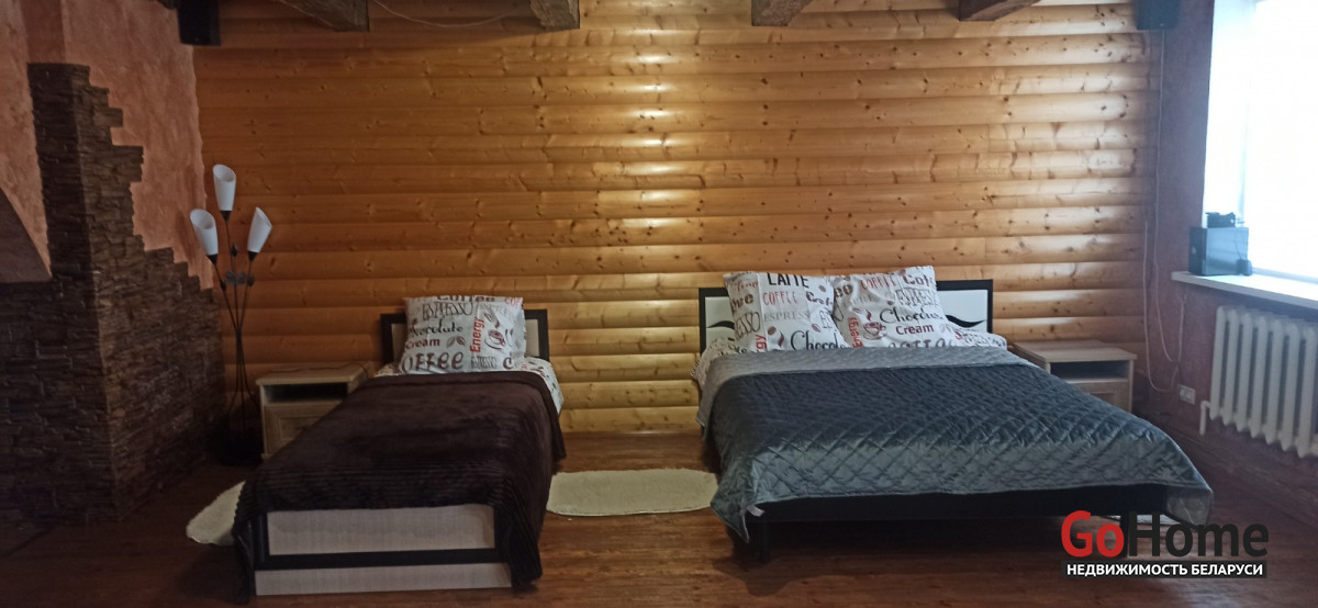 В деревне Боровики расположенной поблизости с санаторием "Радон" сдается 2 этаж частного дома. Площадь главной комнаты 60кв.м.На 2 этаже расположена главная комната и совмещенный санузел. В 1 половине главной комнаты имеется 2 кровати, 2-х спальная и вторая односпальная. У каждой кровати имеется тумбочка, напротив кроватей расположены стол, комод, камин и кресло-качалка. Над камином расположен телевизор с доступом в интернет. Если же посмотреть на 2 часть комнаты, то можно увидеть длинный обеденный стол, вокруг него расположен диван и стулья. Также во 2-й части комнаты имеется холодильник, микроволновая печь, так же предоставляются столовые приборы и посуда .В душевой комнате имеется большая раковина над которой расположено зеркало, душ высотой примерно 1.80м., имеются новые полотенца, фен и утюг.