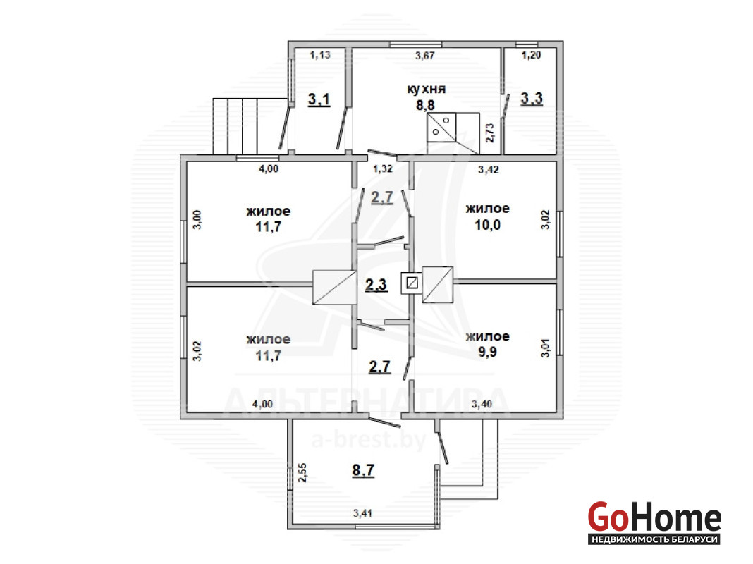 Жилой дом в г.Бресте. 1968 г.п. 1 этаж. Общ.СНБ - 74,9 кв.м, общ.- 66,2 кв.м, жил.- 43,3 кв.м, кух.- 8,8 кв.м. 4 комнаты, высота потолка - 2,60 м.