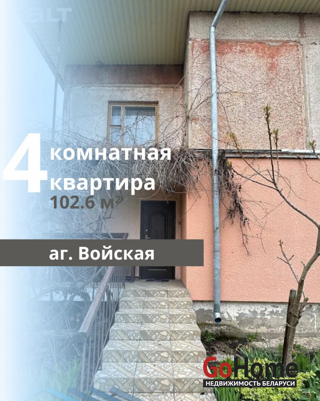4-комнатная квартира в двухэтажном двухквартирном блокированном жилом доме с отдельным входом. Квартира находится в аг. Войская. Общая площадь квартиры 102,6 кв.м., жилая 51,5 кв.м., кухня 9,5 кв.м. Два балкона, раздельный санузел. В квартире есть две большие кладовые и погреб. Все комнаты изолированные. В кухне и комнате установлены стеклопакеты.