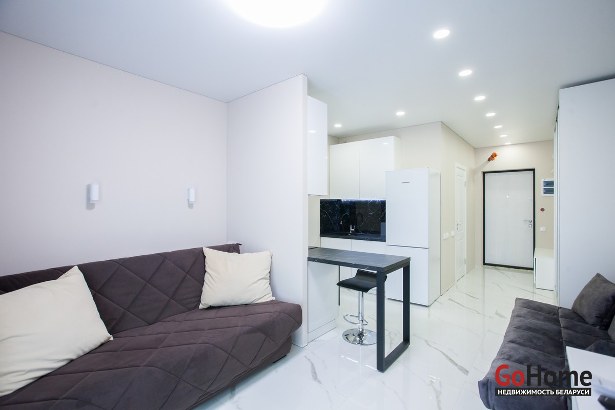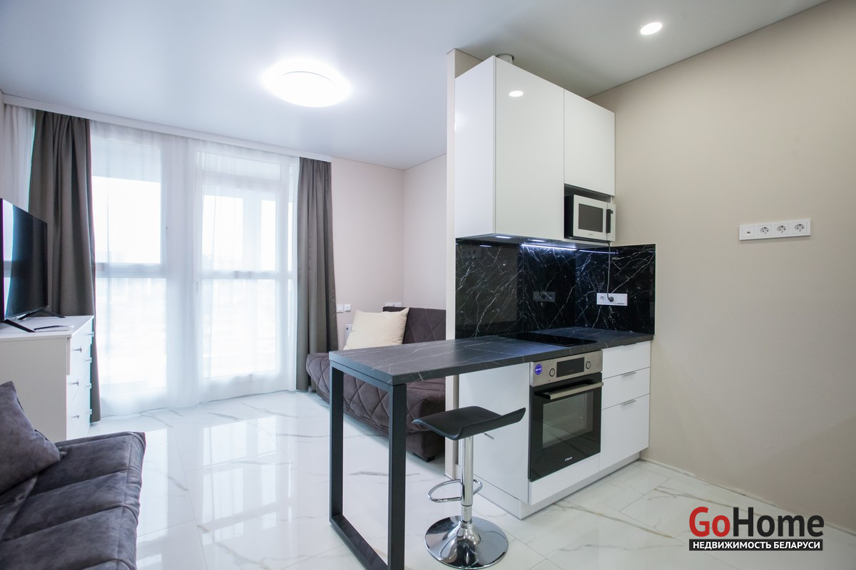 Сдается квартира-студия с дизайнерским ремонтом в доме «Канны» район Minsk Word. Квартира полностью готова к комфортному проживанию. Немецкие теплые полы по всей квартире, плитка Laparet, также на балконе. Установлен проточный нагреватель Indesit. Телевизор 55 дюймов Samsung. Удобный раскладной диван ASCONA c встроенным спальным ортопедическим матрасом, гостевой диван. Барная стойка с удобными барными стульями. Шкаф купе. Шторы блэкаут. Интернет. Станция метро Ковальская слобода в 15 минутах ходьбы