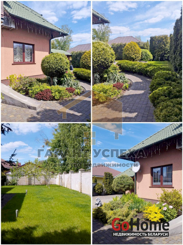 Участок по периметру огорожен кирпичным забором. Въездные ворота и калитка металлические. Высажен газон, цветы, кустарники, туи, выполнен ландшафтный дизайн, дорожки вымощены плиткой.