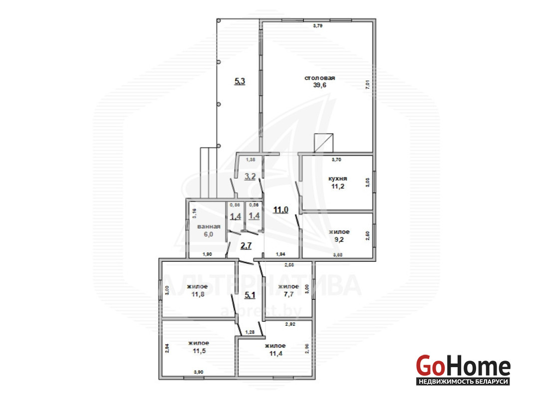 Агроусадьба в Жабинковском р-не. 1976 г.п. Реконструкция 2014г. 1 этаж. Общ.СНБ - 138,5 кв.м, общ.- 130,0 кв.м, жил.- 91,2 кв.м, кух.- 11,2 кв.м. 6 комнат, высота потолка - 2,67 м.
