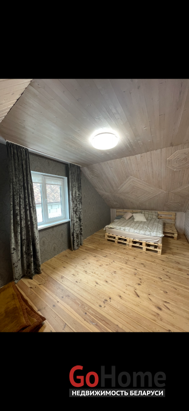 На втором этаже 2 комнаты и просторный коридор, все обшито вагонкой и окрашено светлой пропиткой, так же частично заклеено обоями.