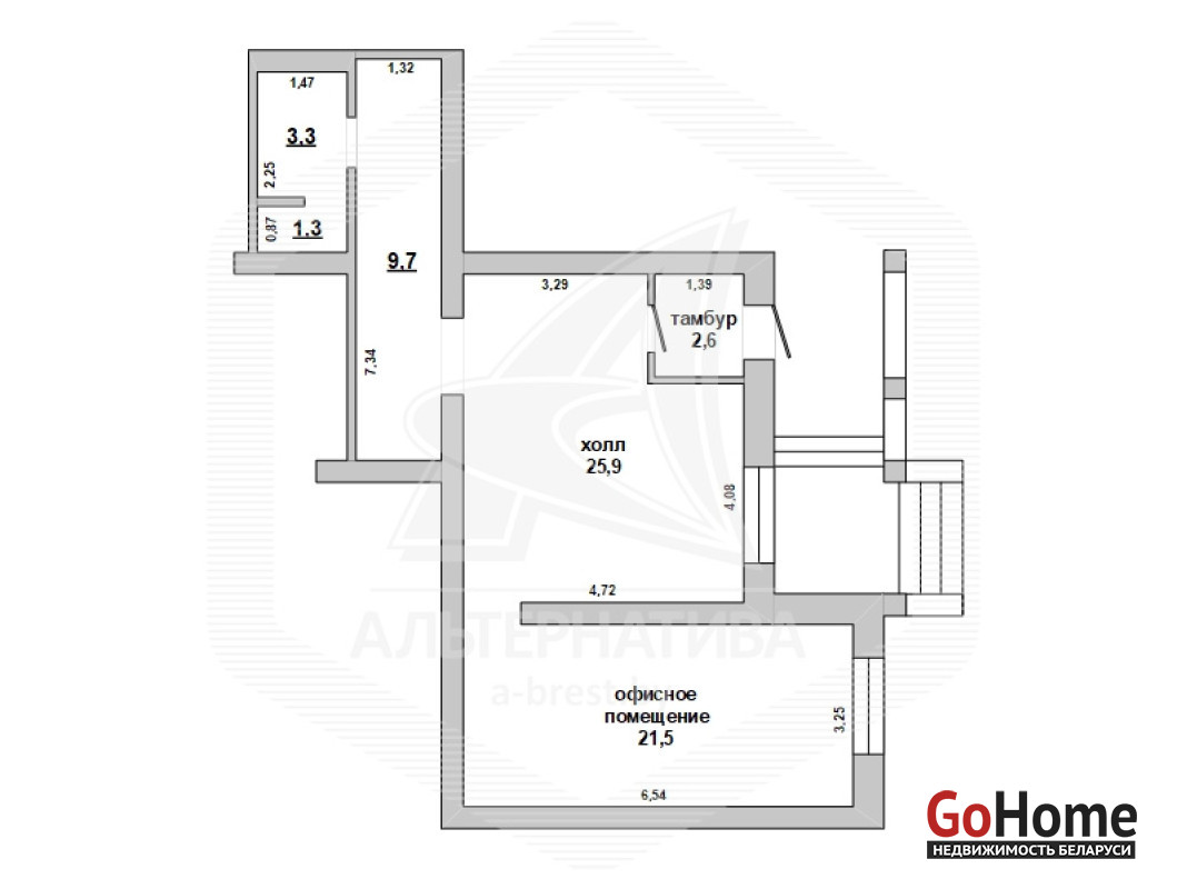 Административное помещение в собственность в районе Речица города Бреста общей площадью 64,3 кв.м. Изолированное помещение с отдельным входом расположено в цокольном этаже многоквартирного жилого дома 2010 года постройки. Без внутренней отделки. Состоит из 2 (двух) помещений разной площади (25,9 + 21,5 кв.м). Отдельный санузел (1,3 кв.м), подсобное помещение (3,3 кв.м), коридор (9,7 кв.м), тамбур (2,6 кв.м). Высота потолков - 2,95 м. Установлены индивидуальные приборы учета электричества и водоснабжения. Парковка перед домом. Рассматриваются все варианты. Лот - 231646